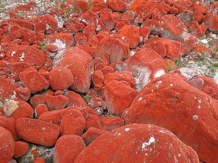 天氣晴朗時(shí),紅石灘的紅石顏色更加漂亮,一條瀑布從山谷間奔流而下,在河水流經(jīng)的河灘上,成片的紅石被藍(lán)天、碧水、綠樹(shù),襯得美艷動(dòng)人……