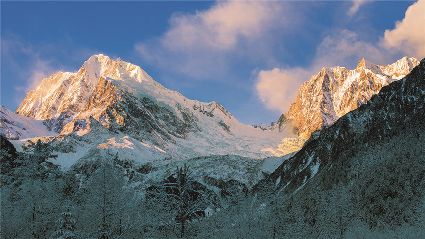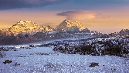 在一片片雪花的飄落中,冬天來了,它帶著風(fēng)、帶著雪,帶著讓人不禁要裹緊衣服的寒冷來了,萬物在冬的腳步中慢慢俯下身子貼緊了大地。蕭索、蒼涼、千里冰封、萬里雪飄……在這些形容冬天的詞語里,我們看到的是只有黑白兩色的畫面,黑的是物,白的是雪。但是,在甘孜州,冬天卻是色彩繽紛的,不僅有白的雪,還有藍(lán)的天、綠的水、黃的樹、紅的葉……還有炊煙升起的藏寨、水汽氤氳的溫泉和日照金山的美麗景致。