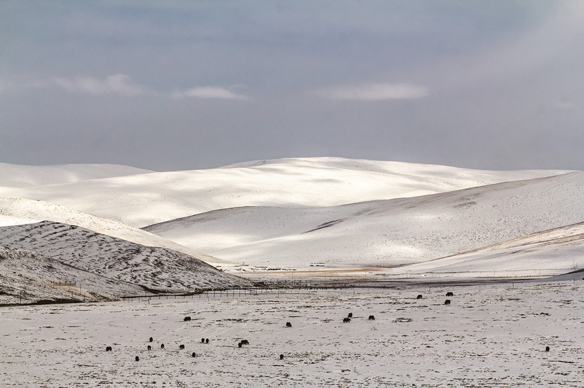 雪后的高原,藍(lán)天白云,大地和連綿到天邊的遠(yuǎn)山,就像被什么過(guò)濾了一樣,一片潔白,滿眼凈是純凈的美,全然沒(méi)有冬日的荒涼,更顯空靈、大氣,盡顯高原獨(dú)特的美。白雪覆蓋的村莊、牧場(chǎng)被河流、大路小徑串連起來(lái),寧?kù)o、秀美,像一幅幅天然的水墨畫(huà),美不勝收。