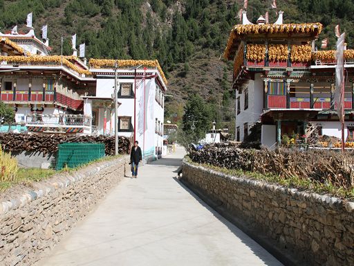 走進冬日的丹巴縣革什扎鄉(xiāng)三道橋村,一幅如詩如畫的鄉(xiāng)村美景映入眼簾:一排排新穎別致而獨具嘉絨特色的白色藏房鑲嵌在彎彎的革什扎河旁,格外耀眼。一條條平直寬敞的硬化路像一根根潔白的哈達連接家家戶戶,寬敞平坦的公路上,轎車、農(nóng)用車、拖拉機穿梭來往,別具一格的村民活動中心紅旗迎風飄揚。 這是如今的三道橋民族團結(jié)新村。