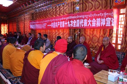 宣講團(tuán)成員勇勇用藏語(yǔ)激情洋溢的宣講黨的十九大精神,現(xiàn)場(chǎng)不斷響起熱烈的掌聲。當(dāng)勇勇講到我國(guó)五年來(lái)取得的輝煌成就時(shí),僧人們都激動(dòng)不已,紛紛為發(fā)展成就點(diǎn)贊。“聽了今天的宣講,我進(jìn)一步了解到了我們國(guó)家這些年來(lái)取得的發(fā)展成就。一直以來(lái),黨對(duì)我們的關(guān)懷是看得見摸得著的,現(xiàn)在我們的寺廟管理越來(lái)越規(guī)范,基礎(chǔ)設(shè)施也得到了完善,通往寺廟的道路也有了明顯改善,我們的生活越來(lái)越好了,這一切都是共產(chǎn)黨的功勞?!彼聫R僧人尺乃表達(dá)著對(duì)黨的感恩。