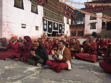 當(dāng)宣講組一行來(lái)到郭沙寺時(shí),寺廟僧人們?cè)缫哑炔患按牡群蛟谒聫R外?!奥犝f(shuō)你們今天要來(lái),我們?nèi)律舷露己芨吲d、很期待?!彼聫R堪布甲它激動(dòng)地說(shuō)。