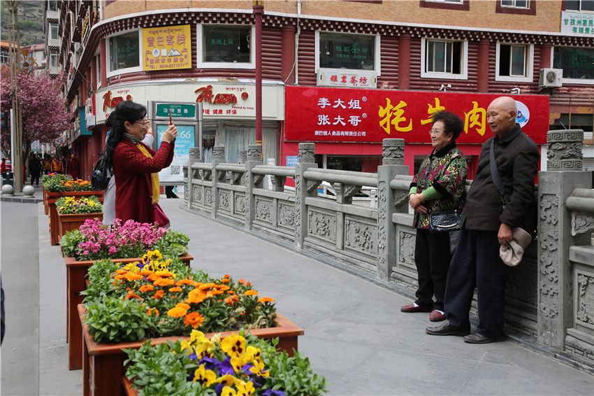 當春天遇見最美的櫻花時,驚艷了整個康定。櫻花與身邊人都將成為春日里的浪漫風景。櫻花之美,美在氣勢,櫻花紛飛,夢幻唯美。每年4月中旬,康定城北門的櫻花綻放后,人們像是約好了一樣聚集到這里,共赴這一場甜美盛宴。這一路繁花似錦,人們穿過枝椏花正盛的櫻花林,穿過粉色海洋,徑直奔向一個浪漫的童話,一路櫻花飄散,一路粉光燦爛。櫻花絢麗繽紛、陸續(xù)綻放,若恰逢一陣春風經(jīng)過,櫻花瓣隨風舞動,猶如紛落的雪花,空氣中浮動著櫻花特有的淡淡香氣,令人不禁懷疑自己置身夢境?!翱刀ǖ拇禾靵淼靡硪恍`放的櫻花,滿街的花草,折多河畔楊柳依依,康定的春天無比驚艷,醉了游人?!敝芟壬贿吪恼?,一邊感嘆,他在康定生活了40多年,20年前的康定,可以說找不到像樣的花草樹木,進入新時代,康定城市變美了,城市綠化走在了前面,城市的美譽度舒適度不斷提升??刀ㄖ海荷珴M園,姹紫嫣紅,風光旖旎。