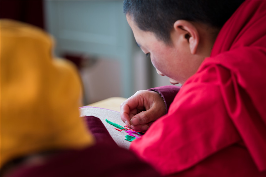 行攝途中經(jīng)過(guò)塔公鎮(zhèn)扎西寺,遇見(jiàn)康定市婦聯(lián)邀請(qǐng)到的中國(guó)國(guó)家級(jí)非物質(zhì)文化遺產(chǎn)藏羌織繡傳承人,正在為自愿報(bào)名的數(shù)十名覺(jué)姆傳授藏繡圖案基礎(chǔ)知識(shí)、藏繡圖案的常見(jiàn)表現(xiàn)形態(tài)、挑繡、納花繡、鏈子扣、扎花、提花、拼花、勾花和手繡等各種繡法技能。佛教的學(xué)習(xí)本是無(wú)止境的,我被這安靜、專注的場(chǎng)景深深感染,按下相機(jī)快門的一瞬就記錄了朵朵盛開(kāi)在指尖的蓮花。