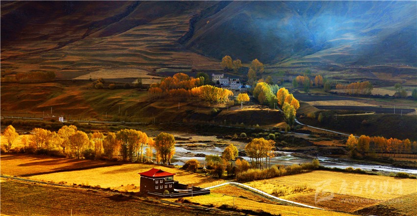 來甘孜賞秋色,怎么能不先做好攻略設(shè)計(jì)?其實(shí)從八月起,秋天的腳步就已經(jīng)來臨,它最先光臨高原的青稞田地,時(shí)間每過去一天,秋日的艷陽(yáng)將雨季趕得越遠(yuǎn),湛藍(lán)的天空下翻滾起來金黃色的麥浪,一直綿延到雪山腳下。深秋炫目過于不食人間煙火,其實(shí)我更喜歡田野里的秋天,有家的溫暖味道。炊煙從藏房民居的屋頂升起,風(fēng)吹麥浪的聲音也壓不過孩子們?cè)谔镆暗臍g笑,開始準(zhǔn)備秋收了,又是一次鄉(xiāng)鄰們的聚會(huì),他們揮舞著鐮刀,在歌聲和笑聲中灑下對(duì)大地和生活的感恩熱愛。