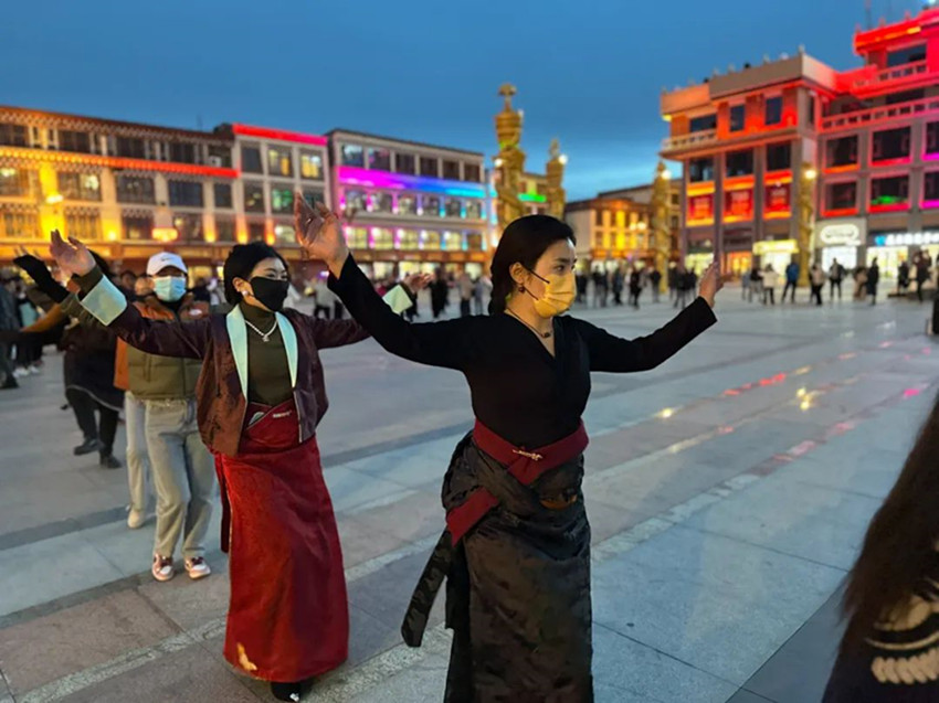 本網(wǎng)訊 每到傍晚時(shí)分,色達(dá)的金馬廣場(chǎng)上都會(huì)準(zhǔn)時(shí)響起起歡快的鍋莊曲。 舞者們雙手隨音樂自然張開,邁著輕快的步伐,踢腿、揚(yáng)手、轉(zhuǎn)圈。游客們有的拿起手機(jī)拍照留念,有的則加入鍋莊舞的隊(duì)列。