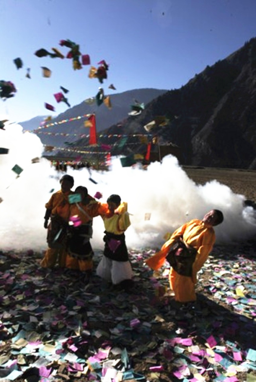 正午時分,村里的小伙子身著節(jié)日盛裝,手持木刀、木劍,肩扛松星到神山去祭山神,將木刀、木劍和松星插在神塔上,他們認為這樣做就可以全副武裝山神了,任何妖魔鬼怪都不敢來侵擾村莊了。小伙子們在神塔旁邊點燃柏枝,撒上青稞酒、糌粑、酥油、茶葉、大米等,然后圍著白塔轉經,呼喚著各種動物的名字,喇嘛在一旁齊聲祈福。新龍人特別注重過十三節(jié),所有讓人興奮的娛樂活動都會在十三這天下午在村子里隆重上演,村民不僅是各種娛樂活動的參與者,更是最忠實的觀看者。