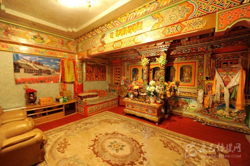 藏族居室一般分臥室、客廳、經(jīng)堂和廚房等部分。室內(nèi)陳設(shè)與裝飾如藏式建筑學者葉啟燊所言:“主次分明,重點突出。主室較為復(fù)雜而樸素,經(jīng)堂偏于華麗而清幽,其余各室均較簡單。室內(nèi)都不施粉刷,但有個別的經(jīng)堂作雕刻裝飾;土司和喇嘛上層的經(jīng)堂則會作油漆的彩畫?!辈貐^(qū)不論是農(nóng)牧民住宅還是貴族上層府邸都有供佛的設(shè)施,經(jīng)堂屬于凈地,是專門供奉神佛的,因此,一般不作他用;主室是藏族住宅中最重要的一個房間,也是功能最多的房間,其中有生活、睡眠、飲食等所需的爐灶、壁櫥、壁架、矮桌、火盆等。這些藏式家具的布置安放,早已形成一定之規(guī)。