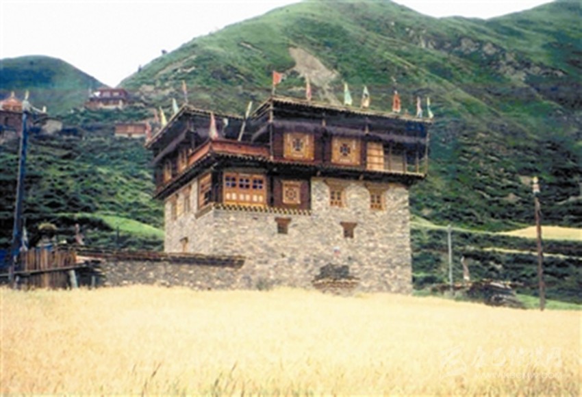 色爾壩藏寨以石頭、泥土、木頭為主要建筑原材料,絕不用水泥、鋼材等現(xiàn)代建材,甚至屋頂也不用瓦片,全部采用泥土,取材十分簡單、方便,然而因為修建全靠人工,工期較長,需要2-4個月或更長時間。當?shù)赝诵莞刹控晠s秋告訴筆者,藏寨房屋層數(shù)有較嚴格的規(guī)定,普遍為3—4層,不少于3層,也不會高于4層,分別象征一個人的頭部、胸部、腹部和腿;底層一般用來關(guān)牲畜或堆放雜物,第二層存貯糧食,第三層居住,第四層設(shè)置佛堂,這種建筑風(fēng)格不同于周邊爐霍、道孚、丹巴民居,自成一體。藏寨造型完全擬人化,外形奇特,上大下小呈倒立的品字形,猶如一個頭戴盔甲、身披戰(zhàn)袍的將軍;房屋上層樓廊外部均以高山柳條垂掛環(huán)繞,以象征大將色爾哇·尼崩達雅的披肩長發(fā);房頂正中的小旗幟就象將士頭盔上的帽纓;房屋右側(cè)隨風(fēng)飄拂的經(jīng)幡,恰似將軍手握長矛在沖鋒陷陣。房屋依山而建,傍山而立,外形高大雄偉。深厚的格薩爾文化為藏寨蒙上了一層神秘的面紗。