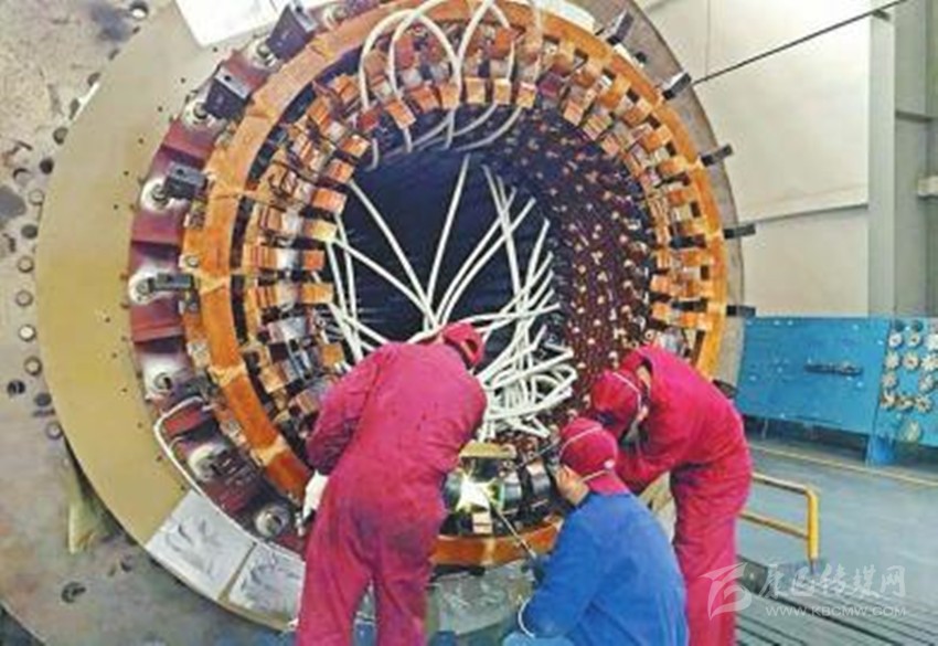2月22日,在東方電機發(fā)電機分廠,工人們正對中煤五彩灣4號機定子進行高工位電路焊接。 東方電氣集團東方電機有限公司供圖