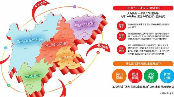 新格局瞄準(zhǔn)的一系列新目標(biāo)讓大家眼前一亮:看區(qū)域發(fā)展,“一干”就是要充分發(fā)揮成都引領(lǐng)輻射帶動作用,“多支”就是要打造各具特色的區(qū)域經(jīng)濟(jì)板塊,“五區(qū)協(xié)同”就是要推動五個經(jīng)濟(jì)區(qū)協(xié)同發(fā)展;看對外開放,東南西北四個方向都有大文章。
