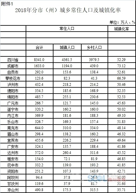3月19日上午,四川省人民政府新聞辦公室召開新聞發(fā)布會(huì),發(fā)布2018年四川省人口統(tǒng)計(jì)公報(bào)。四川新聞網(wǎng)記者從會(huì)上獲悉,四川省公安廳提供的數(shù)據(jù)顯示,2018年末全省戶籍人口9121.8萬人,其中城鎮(zhèn)人口3271.5萬人,鄉(xiāng)村人口5850.3萬人,戶籍人口城鎮(zhèn)化率35.87%。