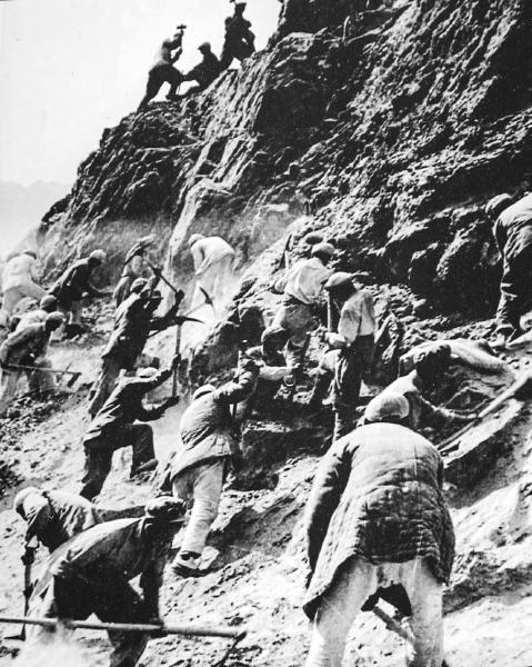 當(dāng)年川藏公路建設(shè)現(xiàn)場。(翻拍自二郎山隧道展板)