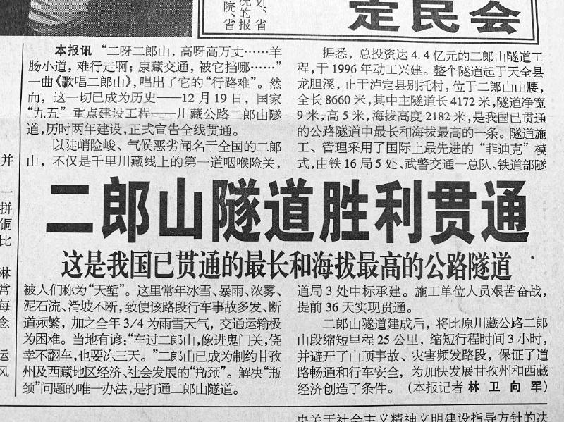 二郎山老路交通瓶頸,影響到甘孜州及西藏地區(qū)經(jīng)濟社會發(fā)展。1996年,二郎山隧道開建,歷時2年,于1998年底貫通?!岸缮剿淼喇?dāng)時是全國最長、海拔最高、地質(zhì)最復(fù)雜的公路隧道,建設(shè)很不容易?!绷中l(wèi)回憶,當(dāng)年采訪建設(shè)二郎山隧道的鐵道部隧道局三處和武警交通一總隊時,曾聽聞隧道開挖中遇到的各種危險,一名現(xiàn)場指揮長就曾被卷入洪水,所幸后來死里逃生。