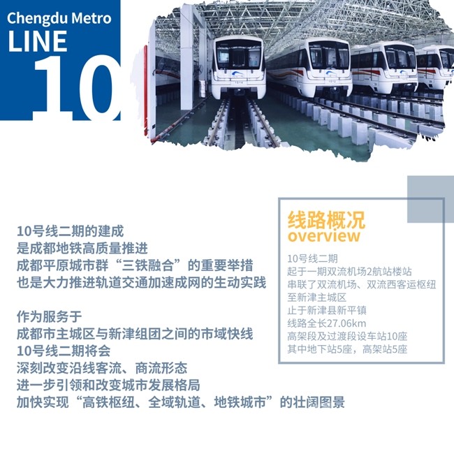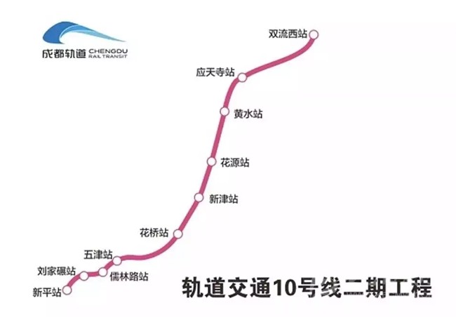 10號線二期起于一期雙流機(jī)場2航站樓站,串聯(lián)了雙流機(jī)場、雙流西客運(yùn)樞紐至新津主城區(qū),止于新津縣新平鎮(zhèn),線路全長27.06km,高架段及過渡段設(shè)車站10座,其中地下站5座,高架站5座。