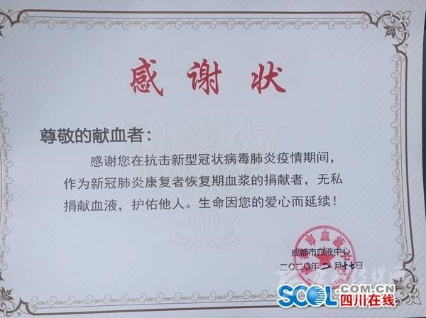 “出院的時候,我特地與我的主治醫(yī)生說,有相關的血液捐贈或者其他配合的需求請隨時聯(lián)系我!”35歲的捐獻者李某表示,這是我首次獻血,我是湖北武漢人,有親戚朋友在成都,當作成都是第二故鄉(xiāng),我是1月22日到成都探親,23日下午發(fā)熱在成都市公共衛(wèi)生臨床醫(yī)療中心確診和治療,2月6日出院。在出院治療期間,李某表示,最難忘的就是每次醫(yī)生來查房,都會鼓勵我說,放心你一定會康復的,“我難忘成都這份恩情!”