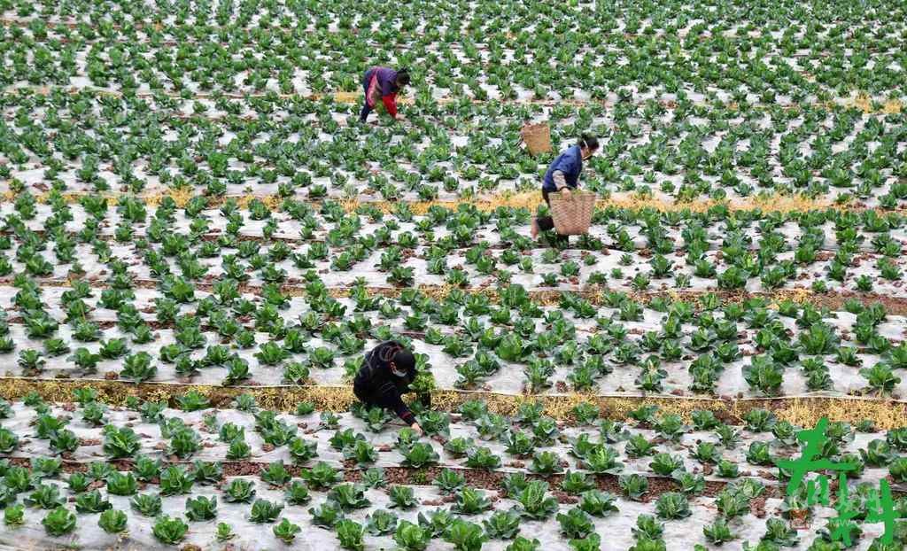 綿竹市紫巖街道雙坪村5組,當(dāng)?shù)剞r(nóng)戶在天佑家庭農(nóng)場(chǎng)收割青菜,以便騰地后用于水稻生產(chǎn)。