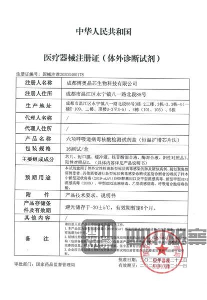 2月22日,國家藥品監(jiān)督管理局應(yīng)急審批通過3個新型冠狀病毒檢測產(chǎn)品,其中之一的“六項呼吸道病毒核酸檢測試劑盒”就是鐘院士提到的試劑,而它則是由位于成都溫江的企業(yè)——博奧生物聯(lián)合清華大學(xué)、四川大學(xué)華西醫(yī)院共同設(shè)計開發(fā)的。這款產(chǎn)品正在迅速應(yīng)用到疫情防控前線,為一線提供快速、精準(zhǔn)、有效診斷。