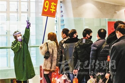 為在疫情期間幫助外出務(wù)工人員安全、順利返崗就業(yè),宜賓市先后采用專列、包車、包機(jī)等多種方式免費運送務(wù)工人員前往省內(nèi)外各地市。圖為當(dāng)日宜賓西站客運員引導(dǎo)外出務(wù)工人員有序登車。