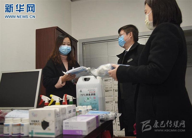 “女子服務(wù)隊”工作人員沈娜(左)向成都市金貿(mào)大廈物管公司管理人員了解防疫物資準備情況(2月28日攝)。 新華社記者 劉坤 攝