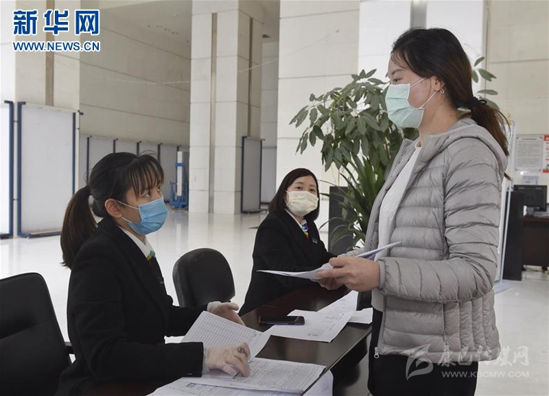 “女子服務(wù)隊”工作人員王秋芳(右)向成都市金貿(mào)大廈物管公司工作人員了解該寫字樓人員進出登記情況(2月28日攝)。 新華社記者 劉坤 攝