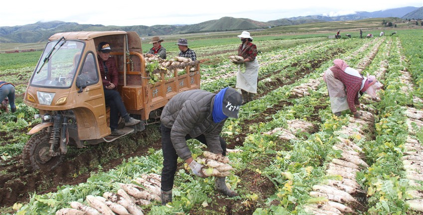 一根根白蘿卜,從理塘縣的沙礫地里,被農(nóng)牧民拔出來(lái),被迅速清洗、包裝,及時(shí)裝上排隊(duì)等候的冷鏈車。過(guò)雅江,翻折多山、二郎山,在雪域高原行駛四百公里后,抵達(dá)川西平原,再上成渝環(huán)線高速,后經(jīng)廈蓉高速,抵達(dá)珠海、深圳,進(jìn)入香港、澳門市場(chǎng)。