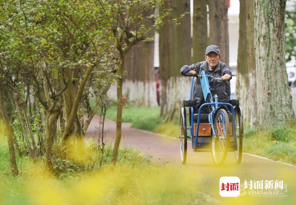 老人四肢殘缺,騎著特制的手搖三輪車,也能行動(dòng)自如。距離老人被截肢已經(jīng)70年了,他早已學(xué)會(huì)獨(dú)立生活。