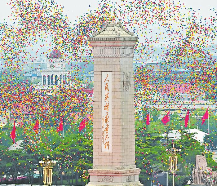 天安門城樓燈火璀璨,廣場上慶祝大會的準(zhǔn)備工作緊鑼密鼓。三軍儀仗隊(duì)、解放軍聯(lián)合軍樂團(tuán),還有北京各高校學(xué)生組成的合唱團(tuán),正在進(jìn)行最后的排練。