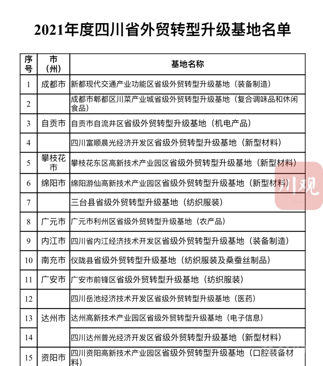 建設外貿轉型升級基地是穩(wěn)定和暢通外貿產業(yè)鏈、供應鏈、推進貿易高質量發(fā)展的重要舉措。2020年,商務廳等省級9部門印發(fā)了《關于加快推進四川省外貿轉型升級基地建設的實施意見(2020—2025年)》,計劃用5年時間,在全省培育外貿基地40個。2020年,首批15個基地率先亮相。