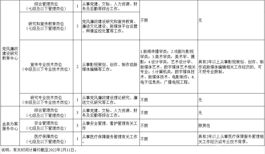 考調(diào)名額 考調(diào)事業(yè)人員25名。其中,信息技術(shù)中心管理崗位9名,黨風(fēng)廉政建設(shè)研究教育中心管理崗位6名、專(zhuān)業(yè)技術(shù)崗位3名,金泉辦案服務(wù)中心管理崗位7名。 考調(diào)對(duì)象及條件 考調(diào)對(duì)象 全省范圍內(nèi)行政單位或參公事業(yè)單位一級(jí)主任科員(含)以下職級(jí)及相當(dāng)職務(wù)層次人員;縣級(jí)及以上公益一類(lèi)或全額撥款事業(yè)單位管理崗位七級(jí)及以下職員、專(zhuān)業(yè)技術(shù)崗位中級(jí)及以下工作人員。 考調(diào)條件 具有良好的政治素質(zhì)、專(zhuān)業(yè)素養(yǎng),品行端正,實(shí)績(jī)突出,群眾公認(rèn)。 中共黨員。 全日制大學(xué)本科及以上學(xué)歷,并取得相應(yīng)學(xué)士及以上學(xué)位。 年齡35周歲以下(1986年2月11日及以后出生)。 歷年年度考核均為合格(稱職)及以上。 身體心理健康,具有正常履行職責(zé)的身體條件和心理素質(zhì)。 符合報(bào)考崗位規(guī)定的資格條件,詳見(jiàn)《中共四川省紀(jì)委四川省監(jiān)委2022年公開(kāi)考調(diào)事業(yè)人員崗位情況表》(附后)。 符合法律、法規(guī)規(guī)定的其他條件。 有關(guān)時(shí)間計(jì)算均截至2022年2月11日。 具有下列情形之一的,不得報(bào)考: 被依法列為失信聯(lián)合懲戒對(duì)象的。 涉嫌違紀(jì)違法正在接受有關(guān)專(zhuān)門(mén)機(jī)關(guān)審查尚未作出結(jié)論的。 受過(guò)黨紀(jì)政務(wù)處分或司法機(jī)關(guān)刑事處罰的。 受到誡勉、組織處理等影響期未滿或期滿影響使用的。 按照有關(guān)規(guī)定,到定向單位工作未滿服務(wù)年限或有其他限制性規(guī)定的。 尚在試用期的。 按照相關(guān)規(guī)定應(yīng)當(dāng)回避的。 法律、法規(guī)規(guī)定的其他情形。 報(bào)名及打印準(zhǔn)考證 2022年2月22日上午8:00至2月26日下午18:00,報(bào)名人員登錄四川省人力資源和社會(huì)保障廳官網(wǎng)(http://rst.sc.gov.cn/)首頁(yè)“人事考試”專(zhuān)欄進(jìn)行網(wǎng)上報(bào)名,每人限報(bào)一個(gè)崗位。 對(duì)報(bào)名人員進(jìn)行網(wǎng)上資格初審,通過(guò)資格初審者可于2022年3月1日上午8:00至3月2日下午18:00,登陸報(bào)名系統(tǒng)打印筆試準(zhǔn)考證。 考試 考試分筆試和面試。其中,信息技術(shù)崗位A、信息技術(shù)崗位B、宣傳專(zhuān)業(yè)技術(shù)崗位需加試專(zhuān)業(yè)測(cè)試。 根據(jù)筆試情況,擇優(yōu)確定進(jìn)入面試的人選,并適時(shí)開(kāi)展資格復(fù)審和心理素質(zhì)測(cè)試。資格復(fù)審、心理素質(zhì)測(cè)試、面試時(shí)間和地點(diǎn)另行電話通知。 考察、體檢及試用 考察 根據(jù)考試情況,擇優(yōu)差額確定進(jìn)入考察對(duì)象,深入考察了解人選政治表現(xiàn)、工作能力、廉潔自律和性格特點(diǎn)等。 體檢 根據(jù)考察情況和職位要求,擇優(yōu)等額確定進(jìn)入體檢人選,參照《公務(wù)員錄用體檢通用標(biāo)準(zhǔn)(試行)》進(jìn)行體檢。 頂崗試用 綜合人選考試成績(jī)、考察情況,根據(jù)工作需要和人崗相適原則,擇優(yōu)確定頂崗試用人選。 調(diào)入 試用期滿后,根據(jù)考調(diào)名額和試用期間表現(xiàn),研究確定擬調(diào)人員,經(jīng)公示后按規(guī)定程序辦理調(diào)入手續(xù)。 注意事項(xiàng) 報(bào)考者應(yīng)保證提供真實(shí)、準(zhǔn)確、全面的個(gè)人信息和資料,如有弄虛作假的行為,將按有關(guān)規(guī)定嚴(yán)肅處理。 資格審查貫穿考調(diào)全過(guò)程,任一環(huán)節(jié)發(fā)現(xiàn)有不符合考調(diào)條件的,取消考調(diào)資格。 報(bào)名時(shí)請(qǐng)按要求填寫(xiě)本人手機(jī)號(hào)碼,并保持通訊暢通。未入圍下一環(huán)節(jié)人員,不再另行通知。 進(jìn)入資格復(fù)審者,需由有干部管理權(quán)限的主管部門(mén)出具同意考調(diào)的書(shū)面意見(jiàn)并加蓋公章。 嚴(yán)明考調(diào)紀(jì)律,報(bào)名者不得托人說(shuō)情、打招呼,一經(jīng)發(fā)現(xiàn)即取消資格。 遵守疫情防控相關(guān)規(guī)定,服從工作人員安排。 同時(shí),四川省紀(jì)委監(jiān)委還提供相關(guān)咨詢電話:028—62555435;62555354。 (點(diǎn)擊查看大圖)
