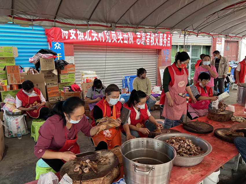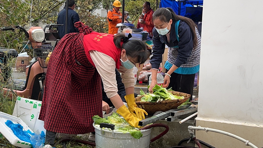 在得妥鎮(zhèn)北頭村的路旁,來(lái)自瀘定縣冷磧鎮(zhèn)桐子林村的李星芳和其他志愿者一起忙著切菜煮飯。她告訴記者,地震發(fā)生后,我主動(dòng)報(bào)名加入志愿者團(tuán)隊(duì)?!拔覀冞@個(gè)點(diǎn)上除了政府發(fā)放的物資,還有很多附近村民和好心人送來(lái)的菜肉和水果,大家都在用自己的行動(dòng)出一份力?!闭诿χ胁说闹驹刚吆樾l(wèi)群說(shuō)。就在記者采訪時(shí),在北頭村開(kāi)飯館的易姝宏一家送來(lái)了鹵菜、排骨和新鮮蔬菜,記賬員茍有成忙著清點(diǎn)數(shù)量并記錄在冊(cè)?!暗卣鸷?,爸媽把年邁的奶奶送到瀘定縣城孃孃家,我也向單位請(qǐng)了假,今天我們一起趕回來(lái)在這里幫忙”。
