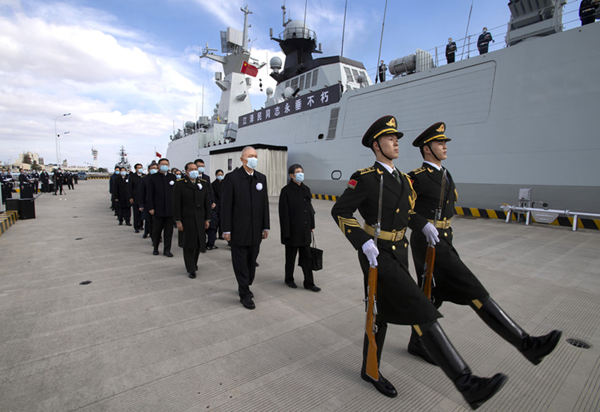 中國人民解放軍海軍揚州艦伏波靜臥,艦上官兵分區(qū)列隊、肅立舷邊。揚州是江澤民同志的故鄉(xiāng)。今天,這艘以揚州命名的軍艦,以最高禮儀送別這位為黨和人民建立了不朽功勛的卓越領(lǐng)導(dǎo)人。江澤民同志的親屬捧護(hù)著骨灰登上揚州艦。海軍笛吹響,儀仗隊持槍肅立,行注目禮。當(dāng)揚州艦起航時,軍港內(nèi)所有艦船汽笛長鳴,響徹云霄。