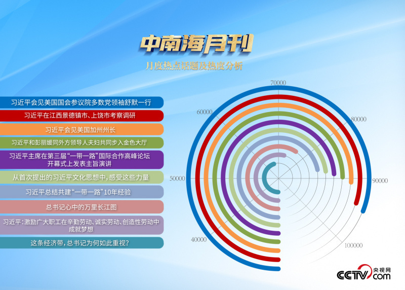 央視網(wǎng)“智聞”系統(tǒng)提取分析10月全網(wǎng)時(shí)政新聞熱點(diǎn)顯示,“習(xí)近平主席會(huì)見美國國會(huì)參議院多數(shù)黨領(lǐng)袖舒默一行”“習(xí)近平會(huì)見美國加州州長”“習(xí)近平主持召開進(jìn)一步推動(dòng)長江經(jīng)濟(jì)帶高質(zhì)量發(fā)展座談會(huì)”等話題最受網(wǎng)民關(guān)注。