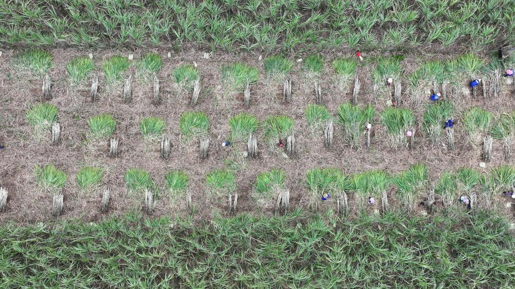 近日,無(wú)人機(jī)拍攝的廣西來(lái)賓市興賓區(qū)蔗農(nóng)正在砍收甘蔗。 新華社記者 周華 攝