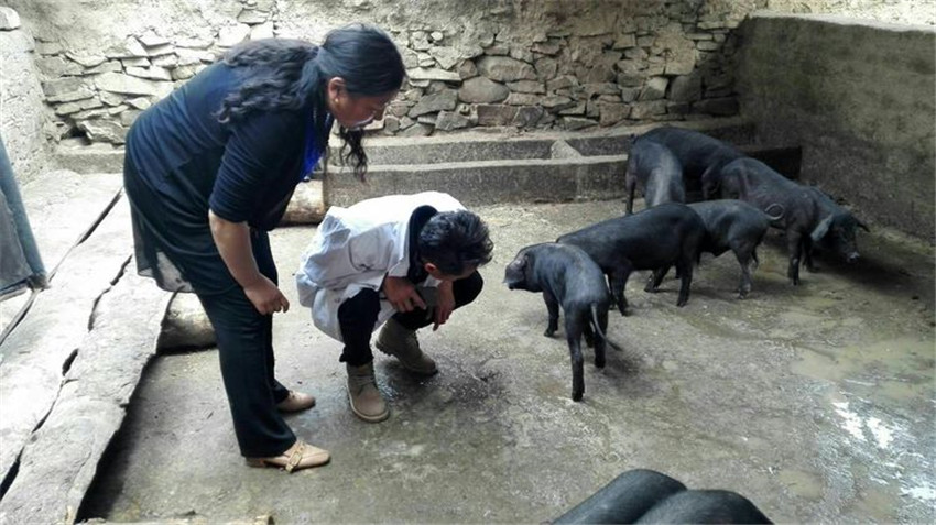 技術(shù)員到養(yǎng)殖戶(hù)家查看藏黑豬長(zhǎng)勢(shì)。
