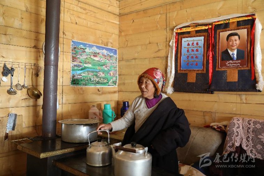 “我是村上第一個掛習主席唐卡畫像的脫貧戶!這幅黑白唐卡是我入住新房當天掛的;幾天后,畫師又送我一幅彩色的,于是我就把這兩幅唐卡并排掛在客廳里。如今,全村家家戶戶都在客廳里掛上了習主席彩色唐卡。要是沒有習主席提出實施精準扶貧,恐怕我們現(xiàn)在還住在山上受窮!”11月28日上午,當筆者來到距德格縣城37公里的龔埡鄉(xiāng)雨托村采訪時,77歲的建檔立卡貧困戶呷瑪西繞指著習主席唐卡畫像激動地說。