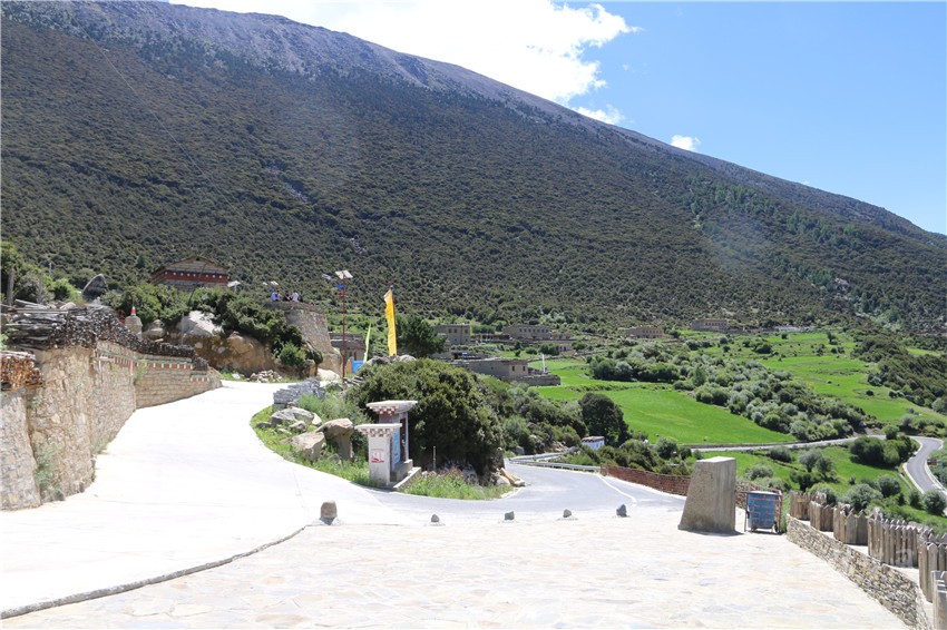 從觀景平臺(tái)向村子進(jìn)發(fā),一棟棟用石塊砌成的藏房次第映入眼簾,每一棟藏房都有獨(dú)立的院落,院墻上是堆放整齊的木柴,墻邊是造型別致的花臺(tái),有的房頂上還掛著五星紅旗。走到村口,黑化通村路變成了硬化聯(lián)戶路,道路寬敞整潔,路旁有太陽(yáng)能路燈、電子監(jiān)控、綠化花草和公共廁所;村中央的廣場(chǎng)上聚滿了人,他們有的是外來游客、有的是當(dāng)?shù)卮迕瘢械脑跁裰?yáng)閑聊,有的在對(duì)著美景拍照。在村里,記者還發(fā)現(xiàn)有幾個(gè)小賣部、不少私家車和好幾大片長(zhǎng)勢(shì)良好的菜地,地里有一些人在勞作。