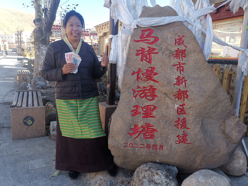 四郎卓瑪在現(xiàn)金分紅后在項目石刻前留影。