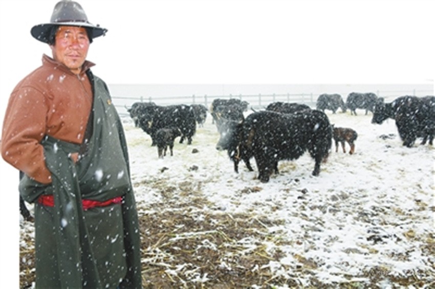 5月8日,甘孜縣達通瑪片區(qū)大雪飛揚。在茶扎鄉(xiāng)銀多村集體牧場,放養(yǎng)人員格絨正在給上百頭牦牛喂草料,他喜滋滋地說,通過牧民儲備和農(nóng)牧農(nóng)村局提供草料的方式,牦??梢园踩^冬。銀多村現(xiàn)代化集體牧場合作社成立一年多的時間,共出欄牦牛16頭,總收益67380元,除去20%預留金,村民有了一定的收入,而作為放牧人員,他管理了52頭牦牛,一年有1.2萬元的收入。