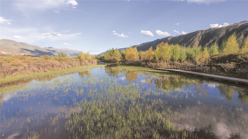 目前,稻城縣金珠濕地植被與濕地恢復打造提升工程項目已完成建設并投入使用。該項目讓昔日的荒地、臭水溝搖身一變“岸綠水清、景色宜人”的濕地公園。
